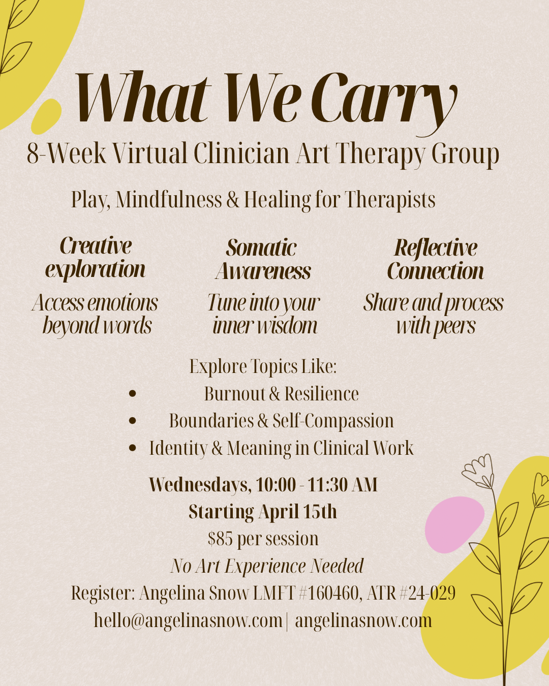 A creative space open to everyone — no therapy background, referral, or art experience needed. Come as you are. We'll explore themes through artmaking, reflection, and open discussion in a welcoming, supportive environment.